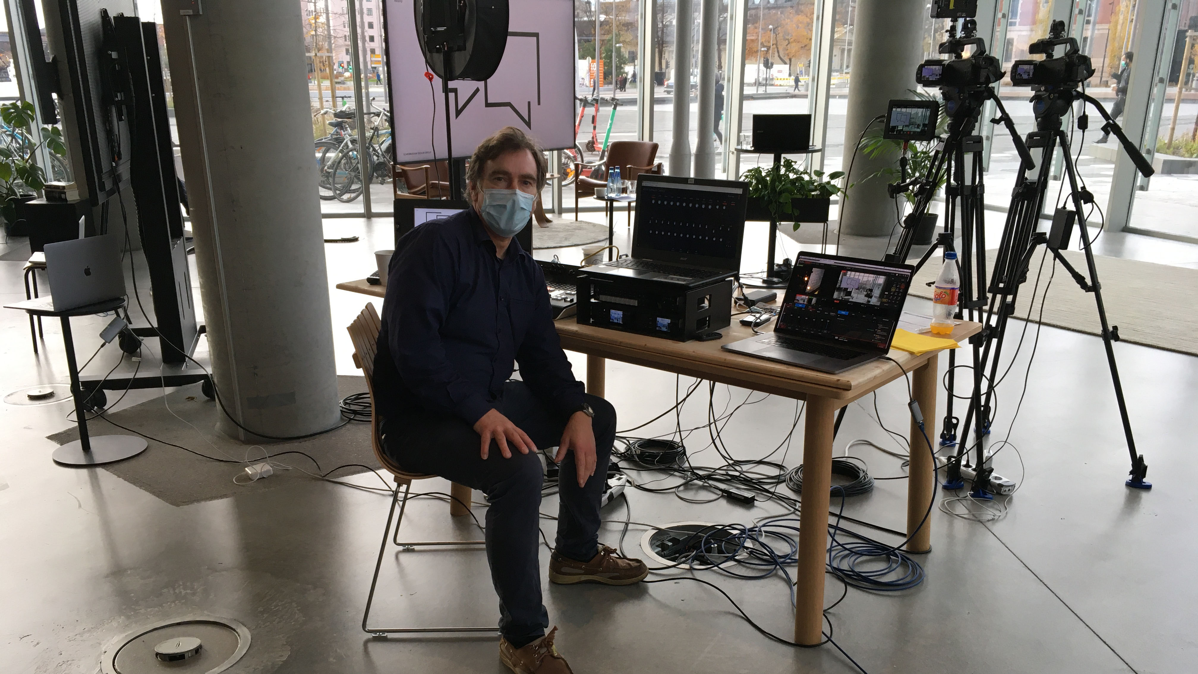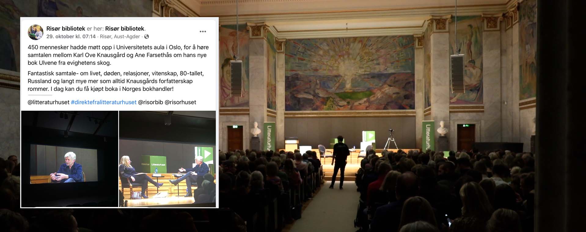 Litteraturhuset i Oslo's bokbad med Karl Ove Knausgård i Universitetets Aula 28. oktober 2021 ble strømmet til folkebiblioteker over hele Norge. Bildeutsnittet (fra Risør biblioteks eget facebook-innlegg om saken) viser hvordan det kunne oppleves for de som fulgte sendingen i bibliotekene.
